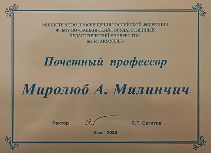 Од 20. до 23. новембра у Уфи је остварена сарадња са Башкирским државним педагошким универзитетом М. Акмулина (БГПУ им. Акмуллы), Регионалним одељењем РГД и многим другим институцијама у сфери науке и културе Републике Башкортостан. Одржано је неколико краћих предавања и презентован је рад Центра РГД у Србији. На Пленарној седници Националног педагошког форума др Мирољуб Милинчић је промовисан за почасног професора Универзитета Акмула (видети 1 и 2). Професорску одору му је уручио ректор универзитета Салават Сагитов.