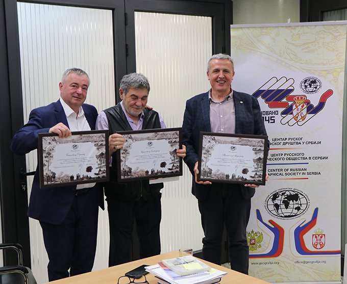 Током 2015. године представници РГД-а остварили су четири петодневне посете географима у Србији, СГД-у и Универзитету у Београду – Географском факултету. Овом приликом је иницирана, договарана и развијана даља сарадња два друштва, али и сарадња географа Србије са регионалним одељењима РГД-а. Такође, интензивна је и преписка између два друштва по овом питању. Почетком октобра месеца 2015. године делегација РГД (Артјом Манукјан, извршни директор, Сергеј Катиков, саветник председника за питања међународне сарадње и Вјачеслав Јеремев) је приликом посете СГД свечано уручила чланске карте професору емеритусу др Стевану Станковићу и професору др Мирољубу Милинчићу. Овом приликом је договорен и модел будуће сарадње кроз оснивање Развојног центра Руског географског друштва у Србији (Центр развития Русского географического общества в Сербии).